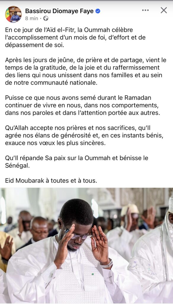 À l’occasion de la célébration de l’Aïd el-Fitr marquant la fin du mois de Ramadan, le Chef de l’État sénégalais s’est adressé à la Nation avec un message de gratitude et d’exhortation. Au-delà des vœux traditionnels, Bassirou Diomaye Faye appelle la Oummah à transformer les acquis spirituels du mois béni, discipline, générosité et dépassement de soi, en un moteur quotidien pour le renforcement des liens familiaux et de la solidarité nationale.