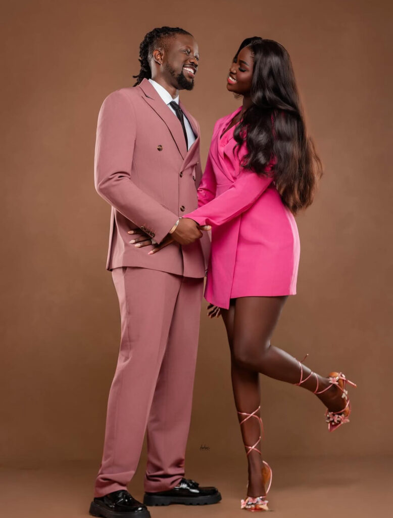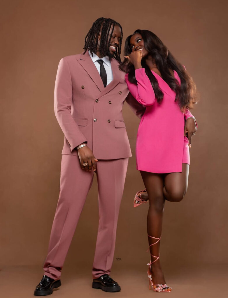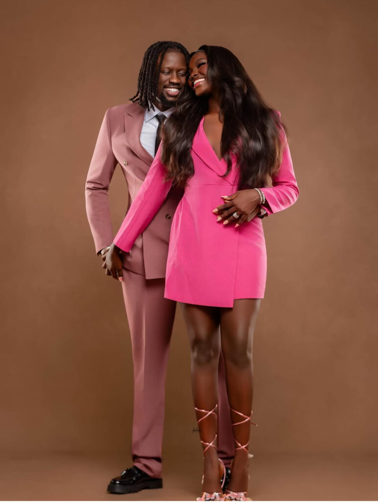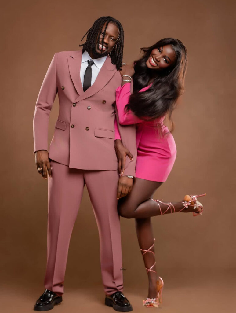 Vêtus de tenues coordonnées dans des tons rosés, ils affichent une parfaite harmonie : Bass Thioung, classe et souriant dans son costume pastel, enlace tendrement Fatou Ndiaye, radieuse dans une robe blazer fuchsia et des talons scintillants. Un cliché glamour qui respire l’amour et la complicité.