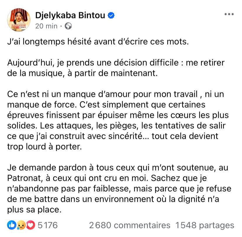 Ce n’est ni un manque d’amour pour mon travail , ni un manque de force. C’est simplement que certaines épreuves finissent par épuiser même les cœurs les plus solides. Les attaques, les pièges, les tentatives de salir ce que j’ai construit avec sincérité… tout cela devient trop lourd à porter.