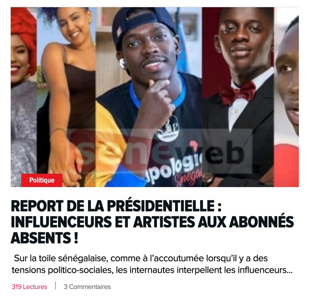 Dudu Fait des Vidéos vient de partager un article de Seneweb dont figure sa photo. Dans cet article, Seneweb clash certains influenceurs pour leur mutisme face à la situation actuelle du pays. Sur sa page Instagram, Dudu partage sa colère et demande à Seneweb d’engager de vrais journalistes.