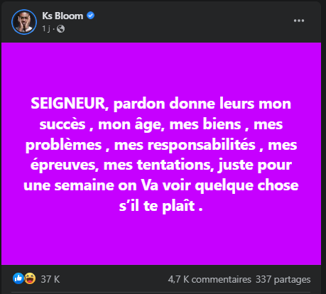 Il y a beaucoup de faites autour de KS Bloom qui sont remis en doute et font objet de critique. Mais le concerné ne reste pas indifférent face à cette situation. Même s’il ne le montre, cela l’affecte et il a décidé de s’exprimer en demandant une faveur au bon Dieu.