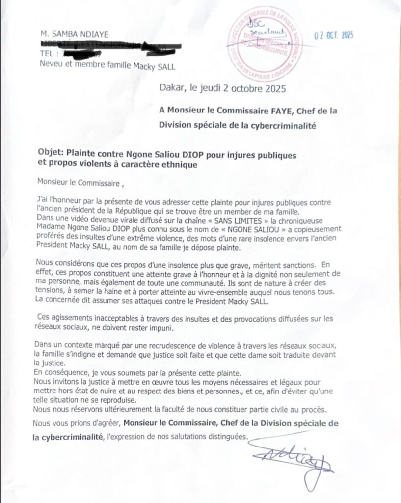 La famille de l’ancien président Macky Sall a saisi la justice suite aux propos tenus par Ngoné Saliou Diop, chroniqueuse sur la chaîne Sans Limites. Une plainte pour injures publiques et propos à caractère ethnique a été déposée ce mercredi à la Division spéciale de la cybercriminalité par Samba Ndiaye, neveu de l’ancien chef de l’État.