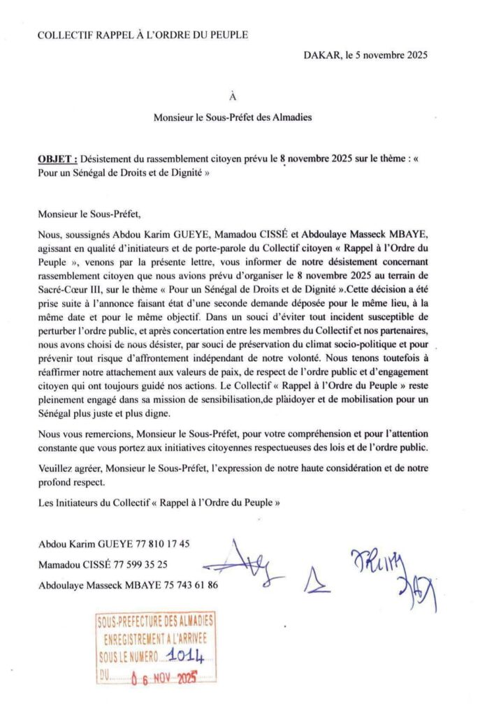 Le collectif citoyen Rappel à l’ordre du peuple a annoncé le désistement de son rassemblement initialement prévu le 8 novembre 2025 au terrain de Sacré-Cœur III, sur le thème « Pour un Sénégal de droits et de dignité ».