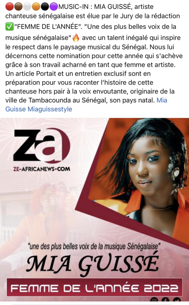 Mia Guissé, l’une des plus belles voix de la musique sénégalaise, est élue par le jury de la rédaction de Ze-AfricaNews Femme de l’année. Une belle distinction pour l’artiste qui vient d’entamer sa carrière solo.