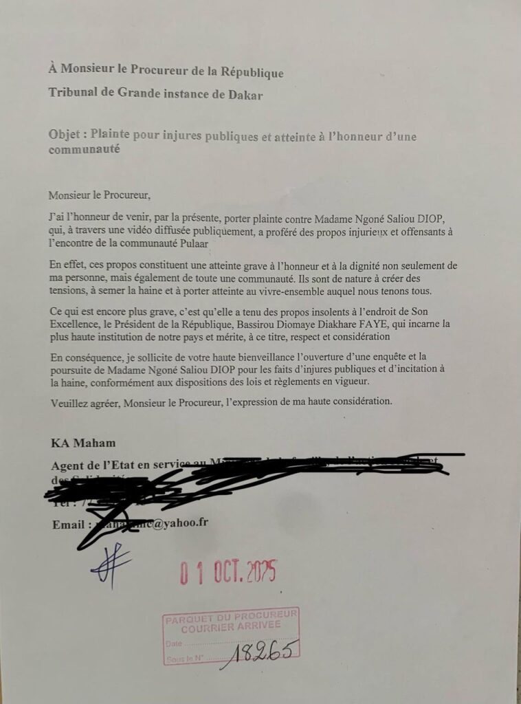 Le syndicaliste Maham Ka a déposé, le 1er octobre 2025, une plainte contre Ngoné Saliou Diop de Sans Limites Tv pour injures publiques et atteinte à l’honneur de la communauté Pulaar. Dans une vidéo diffusée en ligne, la mise en cause aurait tenu des propos jugés offensants à l’endroit de cette communauté et du président Bassirou Diomaye Diakhare Faye. Le plaignant, secrétaire du Mouvement national des jeunes de la CSA, demande l’ouverture d’une enquête et la poursuite de la journaliste pour incitation à la haine.