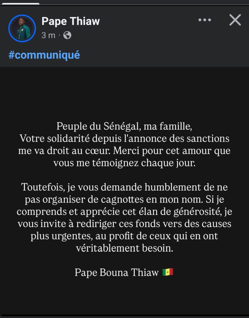 Cependant, dans un message empreint d’humilité et de responsabilité, Pape Bouna Thiaw a clairement demandé à ses soutiens de ne pas organiser de cagnottes en son nom. Tout en reconnaissant et appréciant cette générosité, il invite plutôt à orienter ces fonds vers des causes plus urgentes et vers des personnes qui en ont réellement besoin.