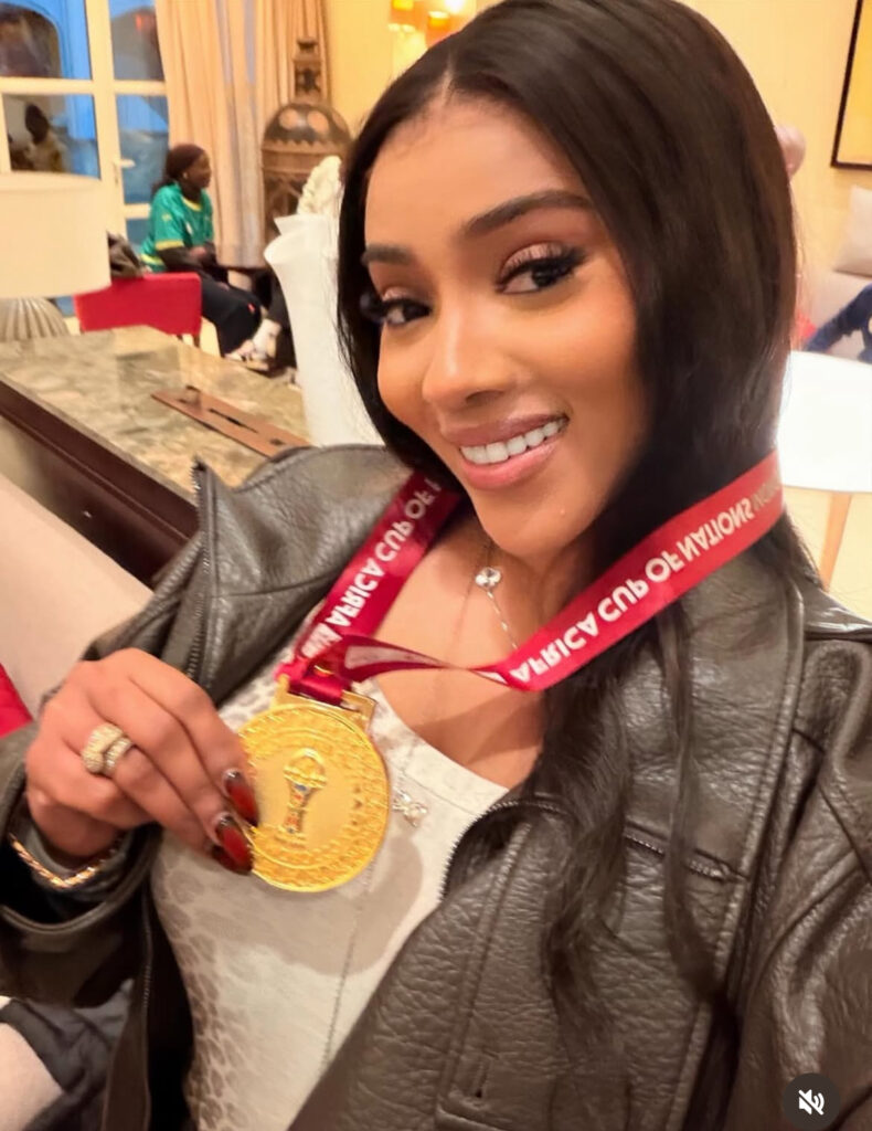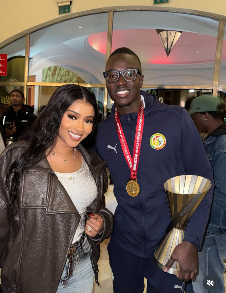 L’animatrice Racky Aidara, épouse de Dora Gaye, s’affiche en toute complicité avec les joueurs du Sénégal après leur sacre à la Coupe d’Afrique des nations au Maroc, allant même jusqu’à poser avec les médailles des joueurs.