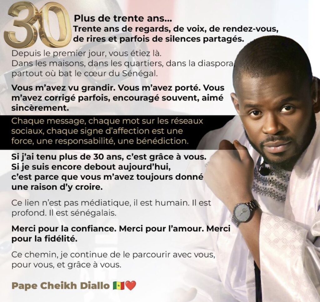 À travers un message empreint d’émotion et de reconnaissance, Pape Cheikh Diallo célèbre plus de 30 ans de parcours aux côtés du public sénégalais.