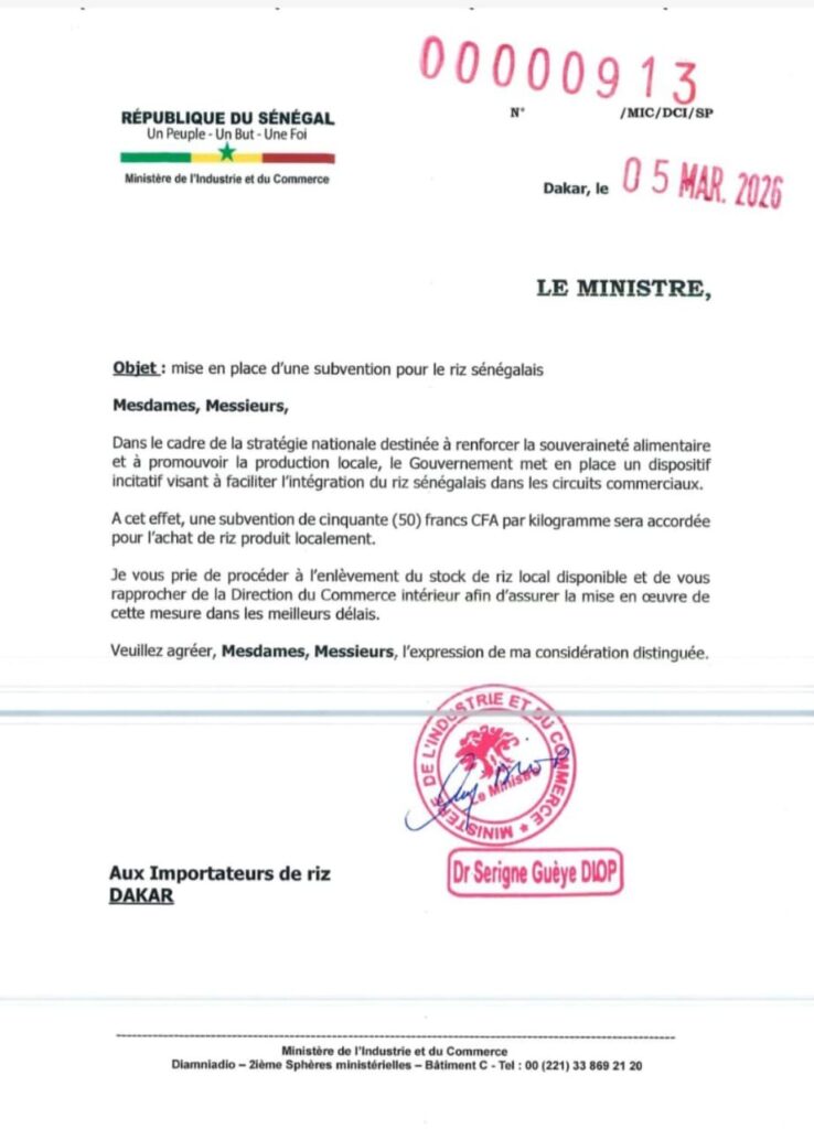 Le ministère de l’Industrie et du Commerce a annoncé la mise en place d’un dispositif visant à faciliter l’intégration du riz sénégalais dans les circuits commerciaux.