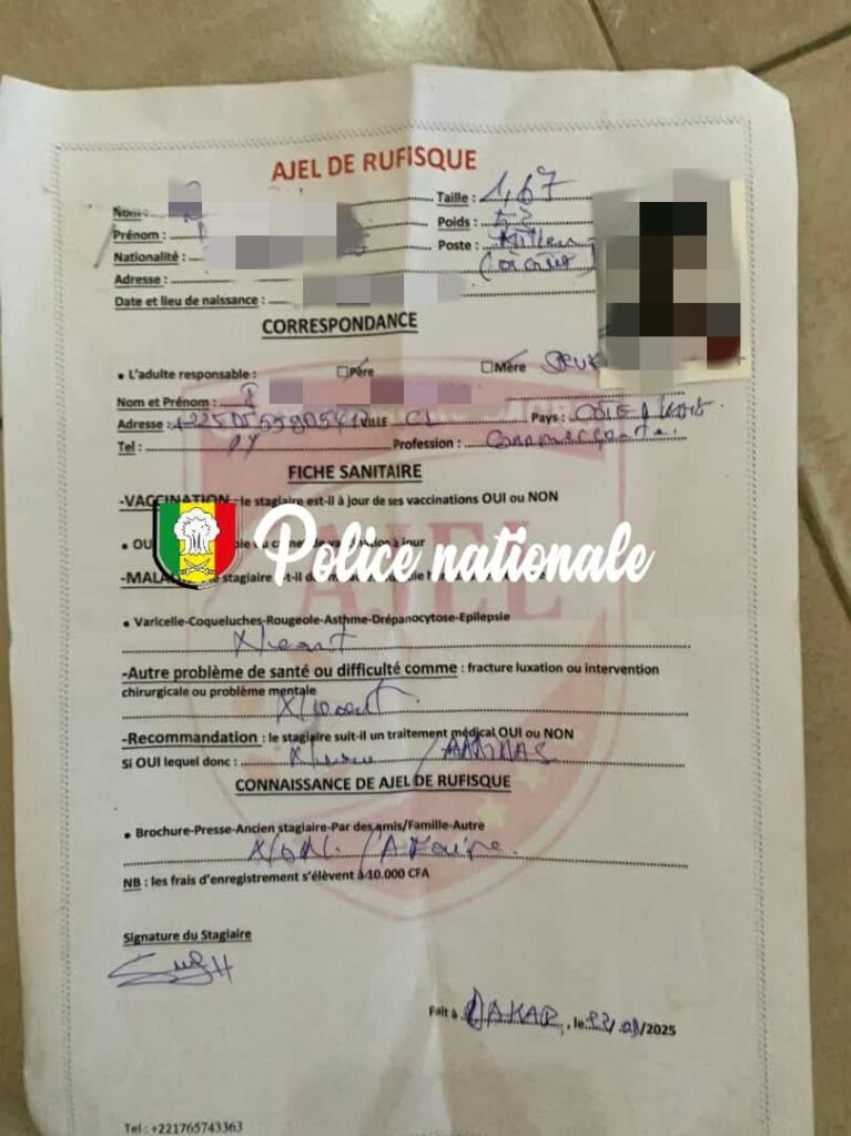 Alertée, la DNLT a procédé à l’interpellation de trois suspects. Les mis en cause ont reconnu appartenir à un réseau d’escroquerie opérant sous couverture d’une prétendue école de football “AJEL de Rufisque” et d’une activité commerciale fictive. Le réseau recrutait principalement des ressortissants de Guinée, du Congo et de Côte d’Ivoire, les obligeant à verser entre 550 000 F et 1,3 million F CFA pour intégrer la structure.