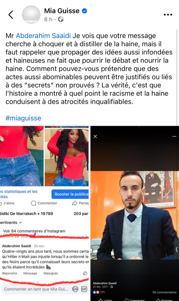 L’internaute, identifié comme Abderahim Saaidi, a tenu des propos jugés racistes et profondément offensants, évoquant de manière choquante Adolf Hitler et tenant des déclarations haineuses à l’encontre des Noirs.